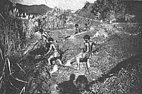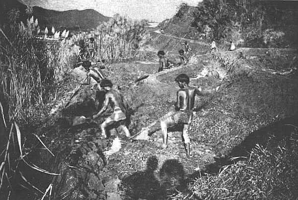 The fields are left in this shape from two to four or five weeks or until ready to be planted. Planting time usually begins in Kiangan about Christmas and continues until the middle of February. In some years, however, as for example, 1912, planting is delayed by drought. Usually about the first of December seed beds are planted. Heads of rice are laid in the middle of a field - in the middle in order to prevent their being stolen by rats or crows. They are laid close together for it is well that the seed rice plants be too thick to grow rapidly. Time is thus left to wait for rains, if need be, or labor, if need be, without the rice in the seed beds growing too large for transplanting. When the field is ready for planting, the water is turned on, the little mounds are scattered, and the loose soil worked until the whole paddy is a mud puddle - a "loblolly." The dike, which has dried and in drying cracked, is repaired. The field is then ready to be planted. The rice plants from the seed bed are transplanted by women. The reason given for allotting this work to them is that the women's fingers are nimbler than the men's. The transplanting is done without the aid of any instrument, such as the sharpened stick used by the Pangasinan people.