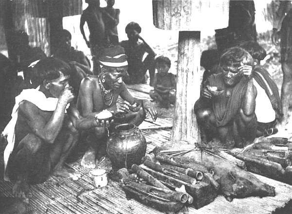 The Termination of the Ceremonies of the Harvest Feast The pig is enwreathed with rice heads, hagaga grass, and the stick with which the pig was killed in ceremonial fashion. The "dean" of the priests sends the pig's soul to the four deity-inhabited regions, there to advocate for the mortals the miraculous increase of the rice. Its soul is then ordered to return to be reincarnated for the "children". | |