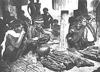 The rice in the lower altitudes is always the first to be planted, and it is the first to be harvested. The harvesting consists in cutting off each individual stalk about twenty-two centimeters below the head, binding the heads into bundles by a bamboo or gaddang tie, carrying the little bundles so made up to the granary, and stacking them below it. The knives used are: first, and usually, the Ifugao ua or small knife whose blade, rigid in the handle, is set at a greater obtuse angle of about 225° with the handle; second, the knife of the Ilokano and Gaddang, consisting of a blade set across a perpendicular handle and held, the handle in the paim, the blade in front of the palm and passing between the middle and ring fingers. The heads are bound into bundles of such size that, in Kiangan district, five or six, in the Lamot district, two and a half, and in the Benaue district, six or seven, bundles make a ganta of threshed rice (three liters). After being stacked under the granary, the rice is left about two weeks until it has thoroughly dried, and until fervent religious prayers, ceremonials, and sacrifices have been performed to secure its miraculous increase in quantity. Harvest time is a highly festive period for all classes. For the old men and women in their capacity as priests and priestesses, it is a continuous round of feasting and drinking with real picnic food and inexhaustible jars of rice wine. For the poor who have lived principally on camotes during the month preceding, it is a time when they gorge themselves on rice and meat - rice and meat every day. For the young people there is singing and there is drinking; there is exchange of gossip, there is good food. And though the sun be hot and shoot down his rays until the heated glaring fields be like furnaces; they enjoy the work nevertheless. In the morning the sexes work separately. But after the heat of the day the two groups of workers gradually and slyly disintegrate and form two new groups. Married men and women work together and exchange witticisms and gossip, occasionally singing in concert. The young men and the unmarried women form a merry group, now singing love songs, now work songs; now screaming and squealing with laughter at the improvisation of one of their number who is singing or chanting extemporaneously - the genius of originality seems to dwell in rice wine! And now coarse (according to our standards) quips fly from one to another, and are quickly picked up and returned with liberal interest. And before the work finishes there is an arrangement of trysting places.