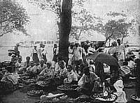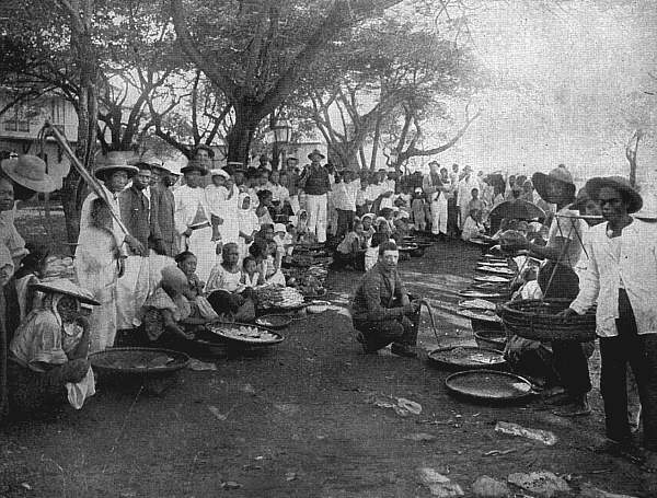 | "This photograph represents the native fruits, melons, etc., usually found in the markets of the various cities and towns. The stands are generally kept by women amd girls, all of whom smoke cigars and cigarettes." | "This market is on the shore of the bay of Cavite, and is a popular resort for our soldiers stationed there, who are attracted as much by the curious people as by the singular products which they offer for sale." |